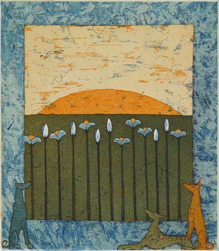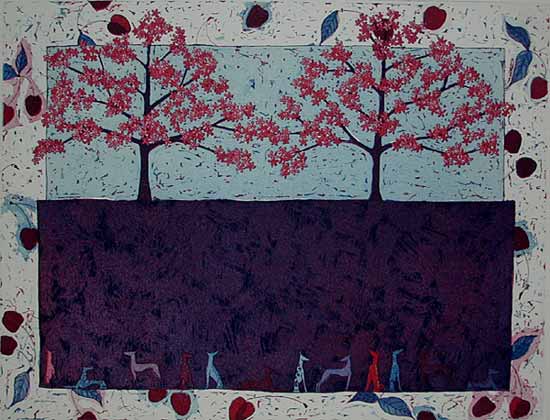 - Kirsikkapuiden vartijat - 2002 viivasyövytys / akvatinta 28 X 36,5 cm |